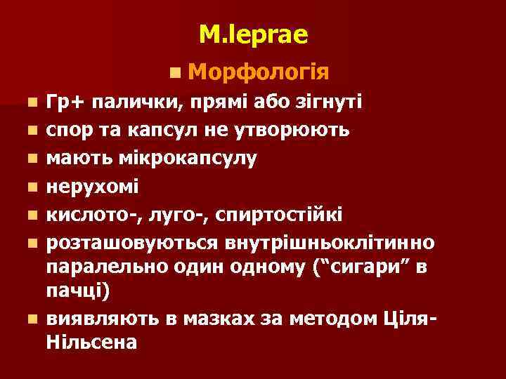 M. leprae n Морфологія n n n n Гр+ палички, прямі або зігнуті спор та капсул не утворюють мають мікрокапсулу нерухомі кислото-, луго-, спиртостійкі розташовуються внутрішньоклітинно паралельно один одному (“сигари” в пачці) виявляють в мазках за методом Ціля. Нільсена