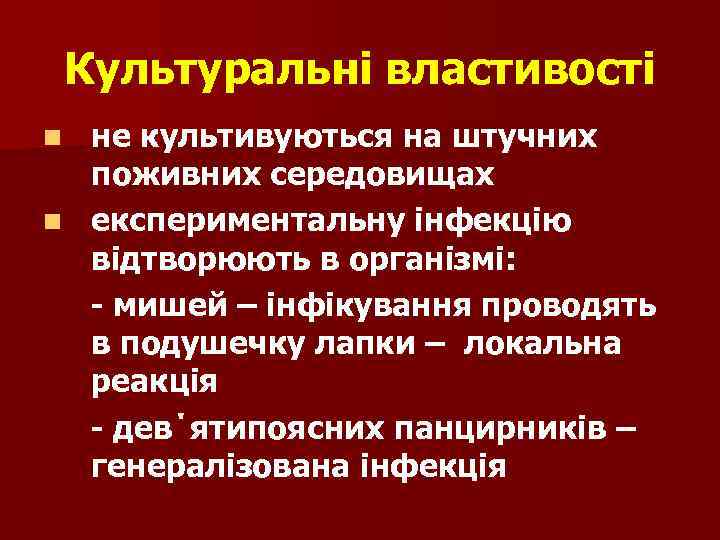 Культуральні властивості не культивуються на штучних поживних середовищах n експериментальну інфекцію відтворюють в організмі: - мишей – інфікування проводять в подушечку лапки – локальна реакція - дев΄ятипоясних панцирників – генералізована інфекція n