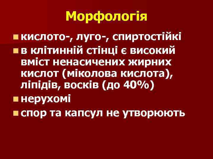 Морфологія n кислото-, луго-, спиртостійкі n в клітинній стінці є високий вміст ненасичених жирних кислот (міколова кислота), ліпідів, восків (до 40%) n нерухомі n спор та капсул не утворюють