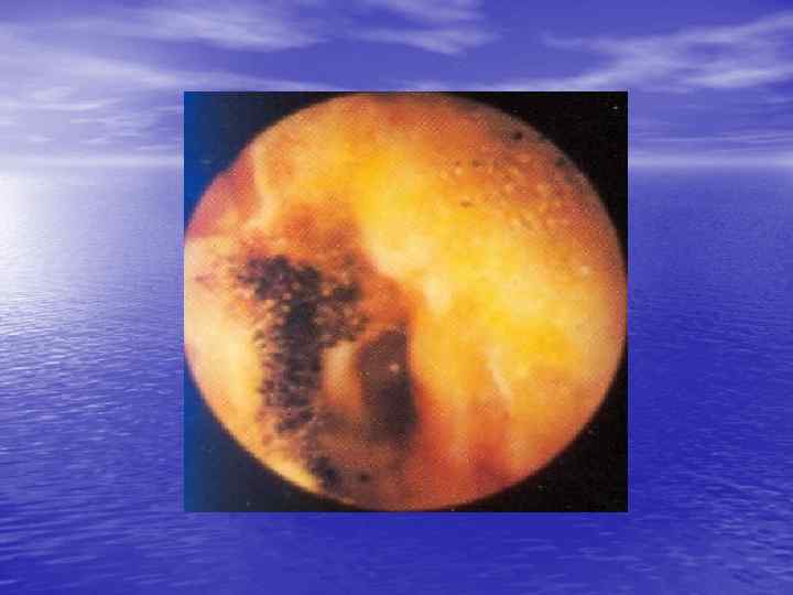 Микозы носа Характерно: деструктивноязвенные изменения в передней трети носовой перегородки, легко кровоточат Риноспоридиоз При кандидозе - отдельные островки налетов Мукороз - склонность к внутриорбитальным осложнениям Мицетома - грибковое тело