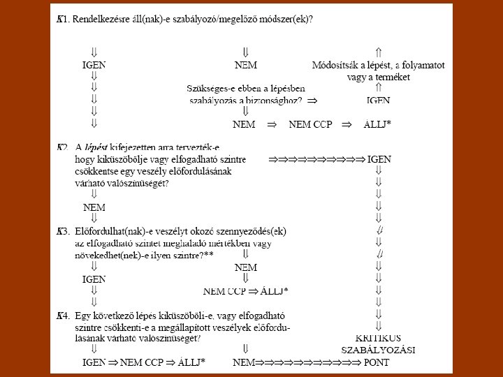 A HACCP 7 alapelve (lépései) 1. 2. 3. 4. 5. 6. 7. A veszélyek (hazards) azonosítása, rangsorolásuk, Kritikus irányítási/szabályozási/felügyeleti pontok (critical control points, CCPs) kiválasztása, ahol a feltételezett (azonosított) veszély megelőzhető, kizárható vagy elfogadható szintre csökkenthető. Azoknak a kritériumoknak az előírása (tehát azon határértékeknek, tűréshatároknak a meghatározása), amelyek a megfelelőt elválasztják a nem megfelelőtől, A kritikus pontok felügyeletére (monitoring) alkalmas módszerek kiválasztása és alkalmazása. Azon helyesbítő intézkedések, tevékenységek meghatározása, amelyeket akkor kell alkalmazni, ha monitoring szerint a CCP „nincs rendben”. Annak az ellenőrzése és bizonyítása (igazolása, verifikálása), hogy a preventív rendszer megfelelően működik (végtermék-vizsgálat) Dokumentálás (a HACCP rendszer működtetését mutató feljegyzések, nyilvántartások).