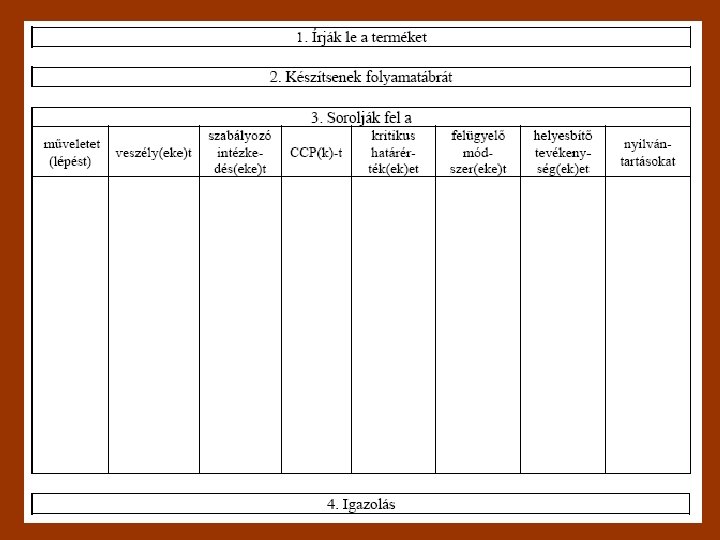 A HACCP alkalmazása 1. 2. HACCP munkacsoport A termék(csoport) teljes leírása (biztonságra vonatkozó információk, mint például az összetétel, a fizikai/kémiai szerkezet (aw, p. H stb. ), a mikrobapusztító, szaporodásgátló kezelések, a csomagolás, a tartóssági és tárolási körülmények és a forgalmazás módja. 3. A tervezett felhasználás meghatározása (a népesség érzékeny csoportjainak figyelembevétele, pl. közétkeztetésnél). 4. A folyamatábrának a tevékenység minden lépését tartalmaznia kell egy adott termékre. 5. A folyamatábra helyszíni megerősítése 6. Minden egyes lépéshez tartozó összes lehetséges veszély felsorolása, veszélyelemzés végzése, és a meghatározott veszélyek szabályozására alkalmas intézkedések átgondolása 7. A Kritikus Szabályozási Pontok meghatározása 8. A kritikus határértékek megállapítása minden CCP-re 9. A felügyelő rendszer felállítása minden CCP-re 10. A helyesbítő tevékenységek meghatározása 11. Az igazolásra szolgáló eljárások megállapítása 12. A nyilvántartás és a dokumentáció létrehozása