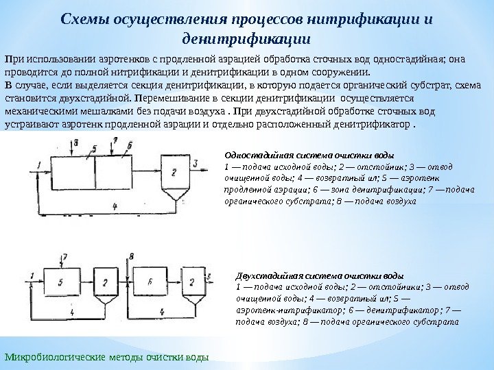 Микробиологические методы очистки воды Схемы осуществления процессов нитрификации и денитрификации При использовании аэротенков с продленной аэрацией обработка сточных вод одностадийная; она проводится до полной нитрификации и денитрификации в одном сооружении. В случае, если выделяется секция денитрификации, в которую подается органический субстрат, схема становится двухстадийной. Перемешивание в секции денитрификации осуществляется механическими мешалками без подачи воздуха. При двухстадийной обработке сточных вод устраивают аэротенк продленной аэрации и отдельно расположенный денитрификатор. Одностадийная система очистки воды 1 — подача исходной воды; 2 — отстойник; 3 — отвод очищенной воды; 4 — возвратный ил; 5 — аэротенк продленной аэрации; 6 — зона денитрификации; 7 — подача органического субстрата; 8 — подача воздуха Двухстадийная система очистки воды 1 — подача исходной воды; 2 — отстойники; 3 — отвод очищенной воды; 4 — возвратный ил; 5 — аэротенк-нитрификатор; 6 — денитрификатор; 7 — подача воздуха; 8 — подача органического субстрата