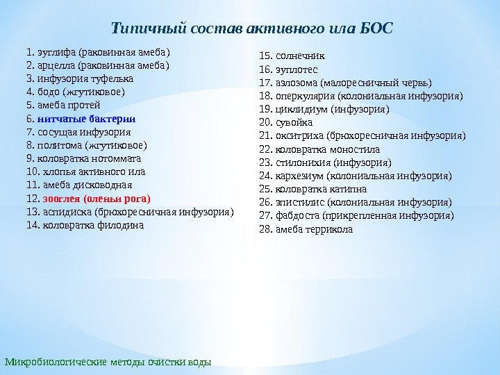 Микробиологические методы очистки воды Типичный состав активного ила БОС 1. эуглифа (раковинная амеба) 2. арцелла (раковинная амеба) 3. инфузория туфелька 4. бодо (жгутиковое) 5. амеба протей 6. нитчатые бактерии 7. сосущая инфузория 8. политома (жгутиковое) 9. коловратка нотоммата 10. хлопья активного ила 11. амеба дисководная 12. зооглея (оленьи рога) 13. аспидиска (брюхоресничная инфузория) 14. коловратка филодина 15. солнечник 16. эуплотес 17. аэлозома (малоресничный червь) 18. оперкулярия (колониальная инфузория) 19. циклидиум (инфузория) 20. сувойка 21. окситриха (брюхоресничная инфузория) 22. коловратка моностила 23. стилонихия (инфузория) 24. кархезиум (колониальная инфузория) 25. коловратка катипна 26. эпистилис (колониальная инфузория) 27. фабдоста (прикрепленная инфузория) 28. амеба террикола