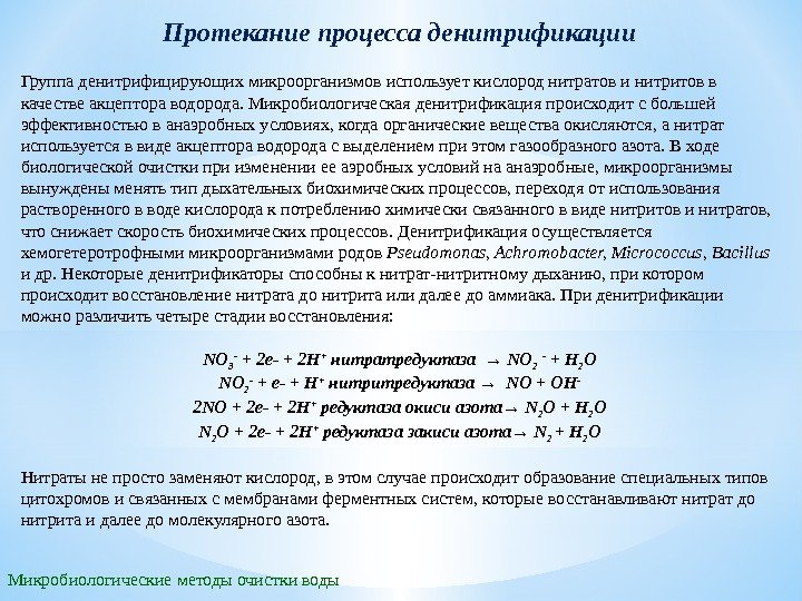 Протекание процесса денитрификации Группа денитрифицирующих микроорганизмов использует кислород нитратов и нитритов в качестве акцептора водорода. Микробиологическая денитрификация происходит с большей эффективностью в анаэробных условиях, когда органические вещества окисляются, а нитрат используется в виде акцептора водорода с выделением при этом газообразного азота. В ходе биологической очистки при изменении ее аэробных условий на анаэробные, микроорганизмы вынуждены менять тип дыхательных биохимических процессов, переходя от использования растворенного в воде кислорода к потреблению химически связанного в виде нитритов и нитратов, что снижает скорость биохимических процессов. Денитрификация осуществляется хемогетеротрофными микроорганизмами родов Pseudomonas, Achromobacter, Micrococcus, Bacillus и др. Некоторые денитрификаторы способны к нитрат-нитритному дыханию, при котором происходит восстановление нитрата до нитрита или далее до аммиака. При денитрификации можно различить четыре стадии восстановления: NO 3 — + 2 е- + 2 Н + нитратредуктаза → NО 2 — + Н 2 О NО 2 — + е- + Н + нитритредуктаза → NО + ОН — 2 NО + 2 е- + 2 Н + редуктаза окиси азота→ N 2 О + Н 2 О N 2 О + 2 е- + 2 Н + редуктаза закиси азота→ N 2 + Н 2 О Нитраты не просто заменяют кислород, в этом случае происходит образование специальных типов цитохромов и связанных с мембранами ферментных систем, которые восстанавливают нитрат до нитрита и далее до молекулярного азота. Микробиологические методы очистки воды