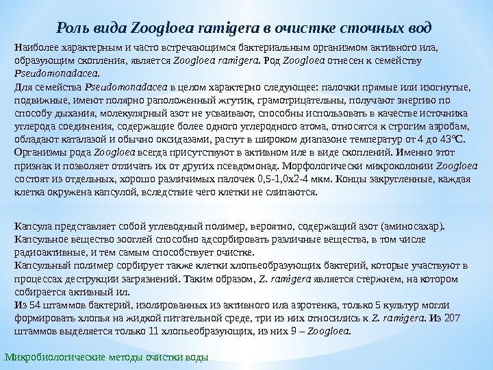 Микробиологические методы очистки воды Роль вида Zoogloea ramigera в очистке сточных вод Z. ramigera растет в широком диапазоне температур от 9 до 37°С opt — 28°С, р. Н=7, не растет в анаэробных условиях, но хорошо переносит их в течение 24 дней. Использует крахмал, инулин, некоторые первичные спирты, насыщенные жирные кислоты, промежуточные продукты цикла Кребса. Аспарагин, аспарагиновую кислоту и глутаминовую кислоту способна использовать в качестве единственного источника углерода и азота. Клетки Z. ramigera способны накапливать длинные цепочки полифосфатов и тем самым помогают удалению из воды соединений фосфора. Z. ramigera. утилизирует фенол, крезол, бензол, толуол. Среда с толуолом предложена в качестве элективной для выделения Элективные среды — специальные питательные среды, создающие более благоприятные условия для роста определённого вида микроорганизмов В определителе Берги род Zoogloea содержит два основных вида : Z. ramigera и Z. filipendula. Последний вид отличается от первого наличием пальцеобразных выростов и несколько большей длинной клеток: средняя длина 4 мкм, а у Z. ramigera – 3 мкм.