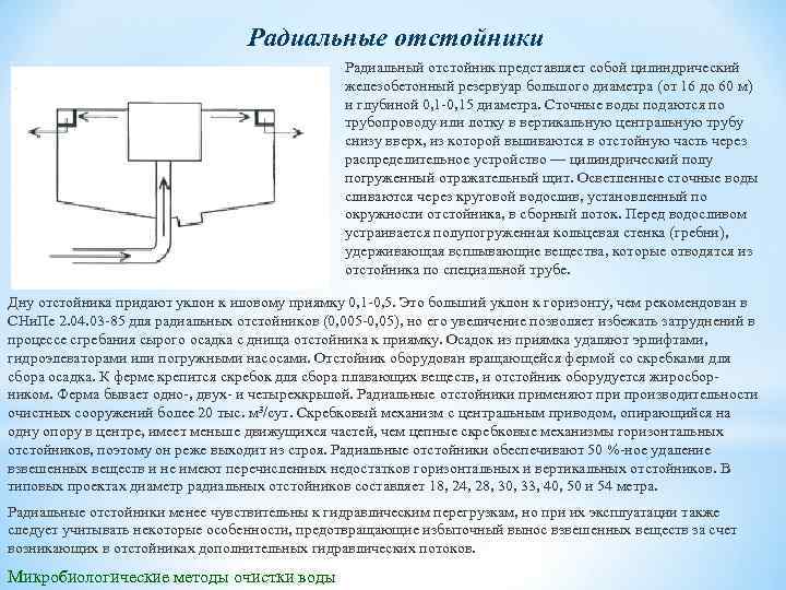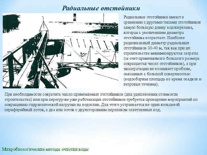 Радиальные отстойники имеют в сравнении с другими типами отстойников самую большую длину водоперелива, которая с увеличением диаметра отстойника возрастает. Наиболее рациональный диаметр радиальных отстойников 30 40 м, так как при их строительстве минимизируются затраты (за счет применяемого большого размера сокращается число отстойников), а при эксплуатации не возникает проблем, связанных с большой поверхностью (водосборная площадь во время осадков и ветровые течения). При необходимости сократить число применяемых отстойников (для удешевления стоимости строительства) или при перегрузке уже работающих отстойников требуется проведение мероприятий по сокращению гидравлической нагрузки на водослив. Для этого устраивается не один кольцевой периферийный лоток, а два или лоток с двухсторонним переливом осветленных вод. Микробиологические методы очистки воды
