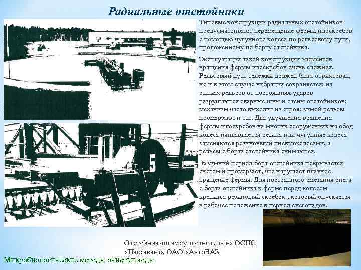 Радиальные отстойники Типовые конструкции радиальных отстойников предусматривают перемещение фермы илоскребов с помощью чугунного колеса по рельсовому пути, проложенному по борту отстойника. Эксплуатация такой конструкции элементов вращения фермы илоскребов очень сложная. Рельсовый путь тележки должен быть отрихтован, но и в этом случае вибрация сохраняется; на стыках рельсов от постоянных ударов разрушаются сварные швы и стены отстойников; механизм часто выходит из строя; зимой рельсы промерзают и т. п. Для улучшения вращения фермы илоскребов на многих сооружениях на обод колеса наплавляется резина или чугунные колеса заменяются резиновыми пневмоколесами, а рельсы с борта отстойника снимаются. В зимний период борт отстойника покрывается снегом и промерзает, что нарушает плавное вращение фермы. Для постоянного сметания снега с борта отстойника к ферме перед колесом крепится резиновый скребок , который опускается в рабочее положение в период снегопадов. Отстойник шламоуплотнитель на ОСПС «Пассавант» ОАО «Авто. ВАЗ Микробиологические методы очистки воды