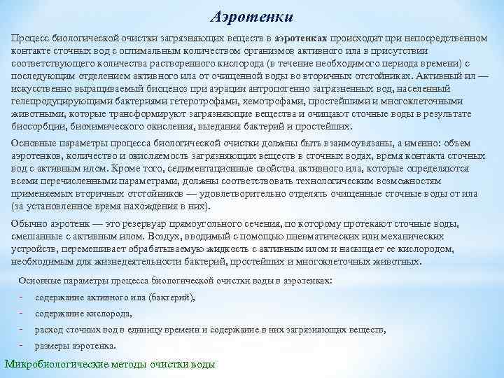 Аэротенки Процесс биологической очистки загрязняющих веществ в аэротенках происходит при непосредственном контакте сточных вод с оптимальным количеством организмов активного ила в присутствии соответствующего количества растворенного кислорода (в течение необходимого периода времени) с последующим отделением активного ила от очищенной воды во вторичных отстойниках. Активный ил — искусственно выращиваемый биоценоз при аэрации антропогенно загрязненных вод, населенный гелепродуцирующими бактериями гетеротрофами, хемотрофами, простейшими и многоклеточными животными, которые трансформируют загрязняющие вещества и очищают сточные воды в результате биосорбции, биохимического окисления, выедания бактерий и простейших. Основные параметры процесса биологической очистки должны быть взаимоувязаны, а именно: объем аэротенков, количество и окисляемость загрязняющих веществ в сточных водах, время контакта сточных вод с активным илом. Кроме того, седиментационные свойства активного ила, которые определяются всеми перечисленными параметрами, должны соответствовать технологическим возможностям применяемых вторичных отстойников — удовлетворительно отделять очищенные сточные воды от ила (за установленное время нахождения в них). Обычно аэротенк — это резервуар прямоугольного сечения, по которому протекают сточные воды, смешанные с активным илом. Воздух, вводимый с помощью пневматических или механических устройств, перемешивает обрабатываемую жидкость с активным илом и насыщает ее кислородом, необходимым для жизнедеятельности бактерий, простейших и многоклеточных животных. Основные параметры процесса биологической очистки воды в аэротенках: содержание активного ила (бактерий), содержание кислорода, расход сточных вод в единицу времени и содержание в них загрязняющих веществ, размеры аэротенка. Микробиологические методы очистки воды