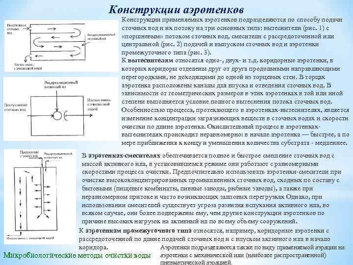 Конструкции аэротенков Конструкции применяемых аэротенков подразделяются по способу подачи сточных вод и их потоку на три основных типа: вытеснители (рис. 1) с «поршневым» потоком сточных вод, смесители с рассредоточенной или центральной (рис. 2) подачей и выпуском сточных вод и аэротенки промежуточного типа (рис. 3). К вытеснителям относятся одно , двух и т. д. коридорные аэротенки, в которых коридоры отделены друг от друга продольными направляющими перегородками, не доходящими до одной из торцевых стен. В торцах аэротенка расположены каналы для впуска и отведения сточных вод. В зависимости от геометрических размеров в этих аэротенках в той или иной степени выполняется условие полного вытеснения потока сточных вод. Особенностью процесса, протекающего в аэротенках вытеснителях, является изменение концентрации загрязняющих веществ в сточных водах и скорости очистки по длине аэротенка. Окислительный процесс в аэротенках вытеснителях происходит неравномерно: в начале аэротенка — быстрее, а по мере приближения к концу и уменьшения количества субстрата медленнее. В аэротенках смесителях обеспечивается полное и быстрое смешение сточных вод с массой активного ила, в установившемся режиме они работают с равномерными скоростями процесса очистки. Предпочтительно использовать аэротенки смесители при очистке высококонцентрированных промышленных сточных вод, сходных по составу с бытовыми (пищевые комбинаты, пивные заводы, рыбные заводы), а также при неравномерном притоке и часто возникающих залповых перегрузках Однако, при использовании смесителей существует угроза развития вспухания активного ила, во всяком случае, они более подвержены ему, чем другие конструкции аэротенков по причине высоких нагрузок на активный ил по всему объему сооружений. К аэротенкам промежуточного типа относятся, например, коридорные аэротенки с рассредоточенной по длине подачей сточных вод и с впуском активного ила в начало коридора. Аэротенки подразделяются также по виду применяемой аэрации на: Микробиологические методы очистки воды аэротенки с механической или (наиболее распространенной) пневматической аэрацией.