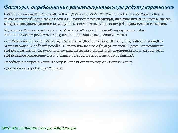 Факторы, определяющие удовлетворительную работу аэротенков Наиболее важными факторами, влияющими на развитие и жизнеспособность активного ила, а также качество биологической очистки, являются: температура, наличие питательных веществ, содержание растворенного кислорода в иловой смеси, значение р. Н, присутствие токсинов. Удовлетворительная работа аэротенков в значительной степени определяется также технологическим режимом эксплуатации, где основное значение имеют: оптимальное соотношение между концентрацией загрязняющих веществ, присутствующих в сточных водах, и рабочей дозой активного ила по массе (при уменьшении дозы ила возникает эффект повышения нагрузки и снижения качества очистки, при увеличении дозы затрудняется эффективное разделение ила и очищенной воды во вторичных отстойниках); необходимое время контакта загрязненных сточных вод с активным илом; достаточная аэробность системы. Микробиологические методы очистки воды