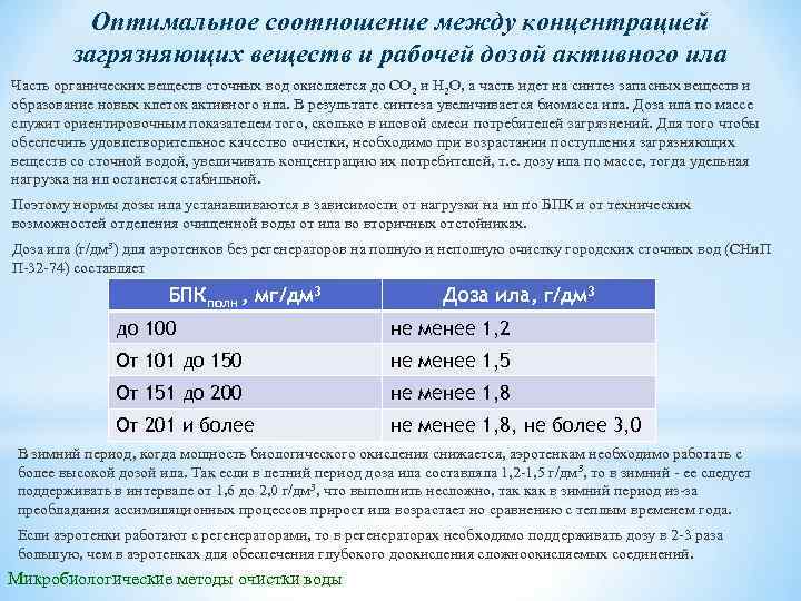 Оптимальное соотношение между концентрацией загрязняющих веществ и рабочей дозой активного ила Часть органических веществ сточных вод окисляется до СО 2 и Н 2 О, а часть идет на синтез запасных веществ и образование новых клеток активного ила. В результате синтеза увеличивается биомасса ила. Доза ила по массе служит ориентировочным показателем того, сколько в иловой смеси потребителей загрязнений. Для того чтобы обеспечить удовлетворительное качество очистки, необходимо при возрастании поступления загрязняющих веществ со сточной водой, увеличивать концентрацию их потребителей, т. е. дозу ила по массе, тогда удельная нагрузка на ил останется стабильной. Поэтому нормы дозы ила устанавливаются в зависимости от нагрузки на ил по БПК и от технических возможностей отделения очищенной воды от ила во вторичных отстойниках. Доза ила (г/дм 3) для аэротенков без регенераторов на полную и неполную очистку городских сточных вод (СНи. П П 32 74) составляет БПКполн , мг/дм 3 Доза ила, г/дм 3 до 100 не менее 1, 2 От 101 до 150 не менее 1, 5 От 151 до 200 не менее 1, 8 От 201 и более не менее 1, 8, не более 3, 0 В зимний период, когда мощность биологического окисления снижается, аэротенкам необходимо работать с более высокой дозой ила. Так если в летний период доза ила составляла 1, 2 1, 5 г/дм 3, то в зимний ее следует поддерживать в интервале от 1, 6 до 2, 0 г/дм 3, что выполнить несложно, так как в зимний период из за преобладания ассимиляционных процессов прирост ила возрастает но сравнению с теплым временем года. Если аэротенки работают с регенераторами, то в регенераторах необходимо поддерживать дозу в 2 3 раза большую, чем в аэротенках для обеспечения глубокого доокисления сложноокисляемых соединений. Микробиологические методы очистки воды