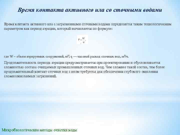 Время контакта активного ила со сточными водами Время контакта активного ила с загрязненными сточными водами определяется таким технологическим параметром как период аэрации, который вычисляется по формуле: где W – объем аэрируемых сооружений, м 3; q — часовой расход сточных вод, м 3/ч. Продолжительность периода аэрации предусматривается при проектировании и обусловливается сложностью состава очищаемых промышленных сточных вод. Чем сложнее такой состав, тем более продолжительный контакт сточных вод с илом требуется для обеспечения глубокого окисления сложноокисляемых загрязнений. Микробиологические методы очистки воды