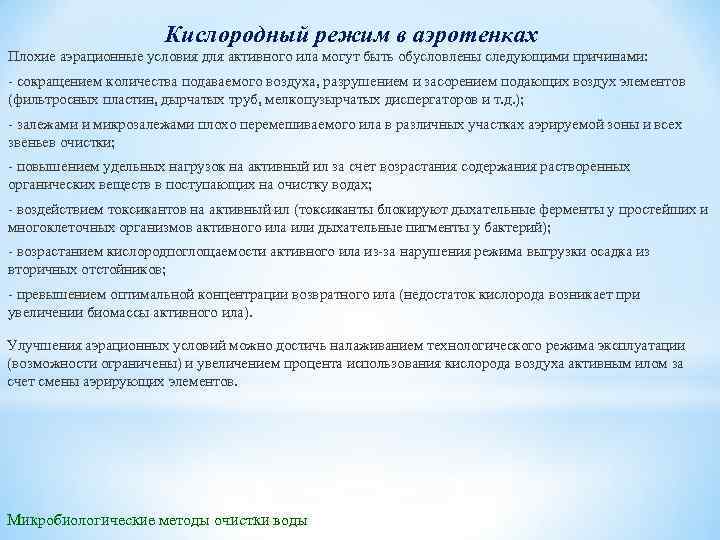 Кислородный режим в аэротенках Плохие аэрационные условия для активного ила могут быть обусловлены следующими причинами: сокращением количества подаваемого воздуха, разрушением и засорением подающих воздух элементов (фильтросных пластин, дырчатых труб, мелкопузырчатых диспергаторов и т. д. ); залежами и микрозалежами плохо перемешиваемого ила в различных участках аэрируемой зоны и всех звеньев очистки; повышением удельных нагрузок на активный ил за счет возрастания содержания растворенных органических веществ в поступающих на очистку водах; воздействием токсикантов на активный ил (токсиканты блокируют дыхательные ферменты у простейших и многоклеточных организмов активного ила или дыхательные пигменты у бактерий); возрастанием кислородпоглощаемости активного ила из за нарушения режима выгрузки осадка из вторичных отстойников; превышением оптимальной концентрации возвратного ила (недостаток кислорода возникает при увеличении биомассы активного ила). Улучшения аэрационных условий можно достичь налаживанием технологического режима эксплуатации (возможности ограничены) и увеличением процента использования кислорода воздуха активным илом за счет смены аэрирующих элементов. Микробиологические методы очистки воды