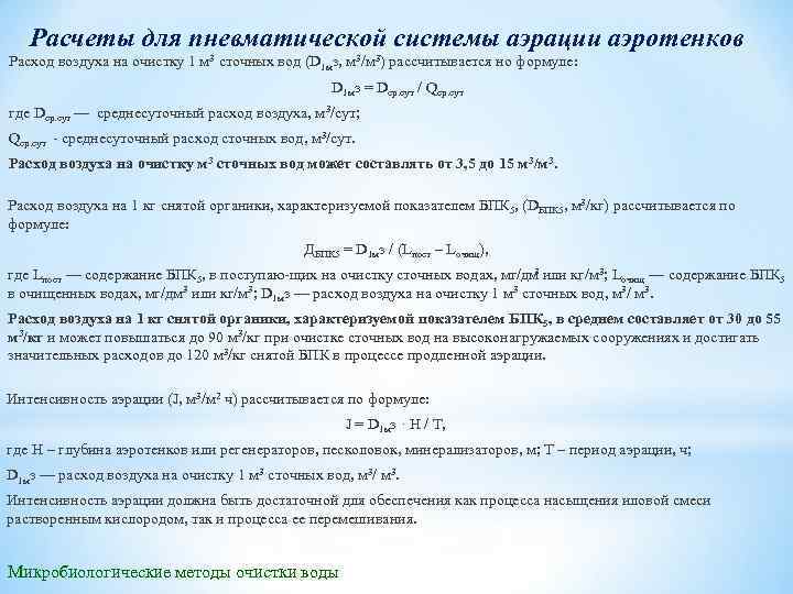 Расчеты для пневматической системы аэрации аэротенков Расход воздуха на очистку 1 м 3 сточных вод (D 1 мз, м 3/м 3) рассчитывается но формуле: D 1 мз = Dср. сут / Qср. сут где Dср. сут — среднесуточный расход воздуха, м 3/сут; Qср. сут среднесуточный расход сточных вод, м 3/сут. Расход воздуха на очистку м 3 сточных вод может составлять от 3, 5 до 15 м 3/м 3. Расход воздуха на 1 кг снятой органики, характеризуемой показателем БПК 5, (DБПК 5, м 3/кг) рассчитывается по формуле: ДБПК 5 = D 1 мз / (Lпост – Lочищ), 3 где Lпост — содержание БПК 5, в поступаю щих на очистку сточных водах, мг/дм или кг/м 3; Lочищ — содержание БПК 5 в очищенных водах, мг/дм 3 или кг/м 3; D 1 мз — расход воздуха на очистку 1 м 3 сточных вод, м 3/ м 3. Расход воздуха на 1 кг снятой органики, характеризуемой показателем БПК 5, в среднем составляет от 30 до 55 м 3/кг и может повышаться до 90 м 3/кг при очистке сточных вод на высоконагружаемых сооружениях и достигать значительных расходов до 120 м 3/кг снятой БПК в процессе продленной аэрации. Интенсивность аэрации (J, м 3/м 2 ч) рассчитывается по формуле: J = D 1 мз · H / T, где H – глубина аэротенков или регенераторов, песколовок, минерализаторов, м; Т – период аэрации, ч; D 1 мз — расход воздуха на очистку 1 м 3 сточных вод, м 3/ м 3. Интенсивность аэрации должна быть достаточной для обеспечения как процесса насыщения иловой смеси растворенным кислородом, так и процесса ее перемешивания. Микробиологические методы очистки воды