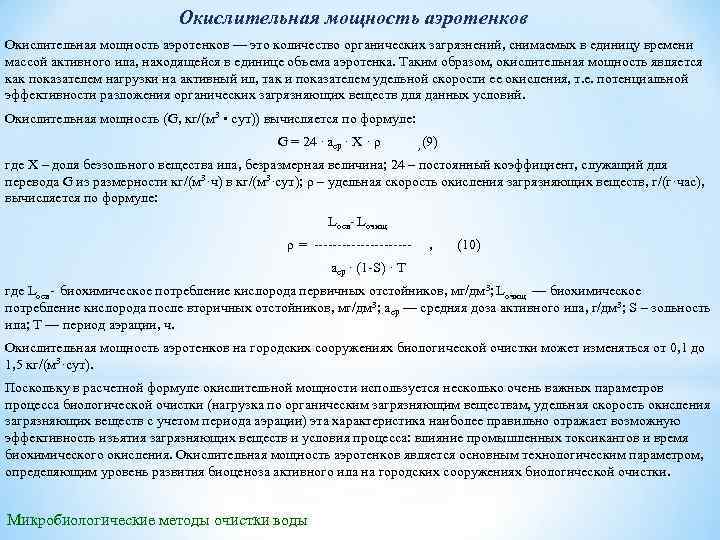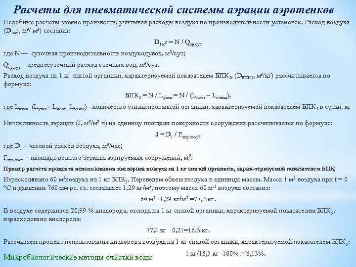 Расчеты для пневматической системы аэрации аэротенков Подобные расчеты можно произвести, учитывая расходы воздуха по производительности установок. Расход воздуха (D 1 мз, м 3/ м 3) составит: D 1 мз = N / Qср. сут где N — суточная производительность воздуходувок, м 3/сут; Qср. сут среднесуточный расход сточных вод, м 3/сут. Расход воздуха на 1 кг снятой органики, характеризуемой показателем БПК 5, (DБПК 5, м 3/кг) рассчитывается по формуле: БПК 5 = N / Lутил = N / (Lпост – Lочищ), где Lутил (Lутил= Lпост Lочищ) количество утилизированной органики, характеризуемой показателем БПК 5 в сутки, кг Интенсивность аэрации (J, м 3/м 2 ч) на единицу площади поверхности сооружения рассчитывается по формуле: J = D 1 / Fаэр. соор, где D 1 – часовой расход воздуха, м 3/час; Fаэр. соор – площадь водного зеркала аэрируемых сооружений, м 2. Пример расчета процента использования кислорода воздуха на 1 кг снятой органики, харак теризуемой показателем БПК 5 Израсходовано 60 м 3 воздуха на 1 кг БПК 5. Переведем объем воздуха в единицы массы. Масса 1 м 3 воздуха при t = 0 °С и давлении 760 мм рт. составляет 1, 29 кг/м 3, поэтому масса 60 м: 1 воздуха составит: 60 м 3 · 1, 29 кг/м 3 =77, 4 кг. В воздухе содержится 20, 99 % кислорода, отсюда на 1 кг снятой органики, характеризуемой показателем БПК 5, израсходовано кислорода: 77, 4 кг · 0, 21=16, 3 кг. Рассчитаем процент использования кислорода воздуха на 1 кг снятой органики, характеризуемой показателем БПК 5: 1 кг/16, 3 кг · 100% = 6, 13%. Микробиологические методы очистки воды
