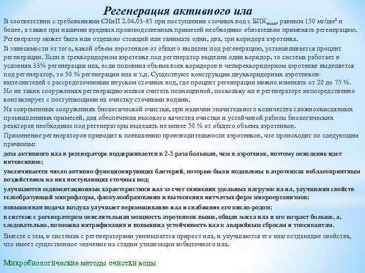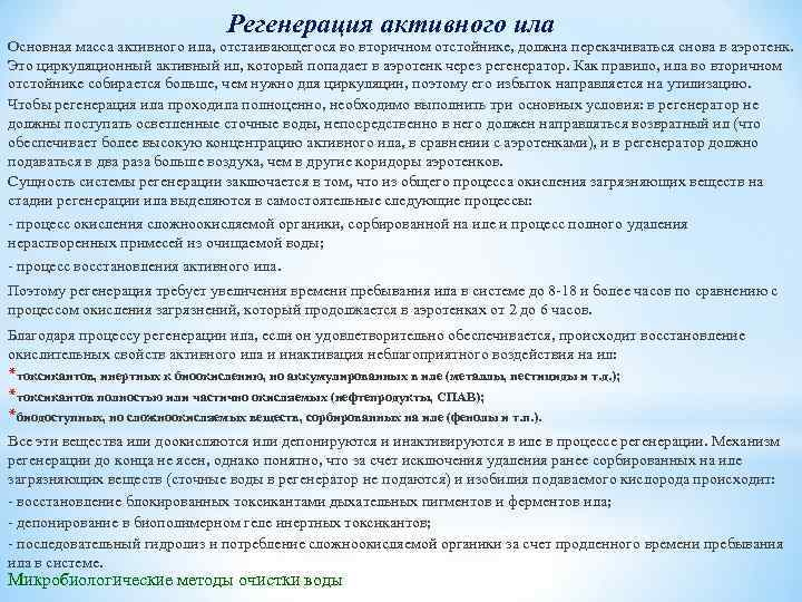 Регенерация активного ила Полноценность регенерации обеспечивается удовлетворительной эксплуатацией сооружений и, в первую очередь, своевременным удалением избыточного активного ила из вторичных отстойников. Даже в условиях удовлетворительной циркуляции ила из отстойника, он поступает в регенератор с повышенной кислородпоглощаемостью, поскольку находится на дне вторичного отстойника в норме до 40 мин (ил не выносит залежей, даже непродолжительных, за счет высокого уровня метаболизма и накопления разнообразных газов внутри хлопьев). По причине поступления в регенератор активного ила с высокой кислородпоглощаемостью из вторичных отстойников, даже более интенсивная подача воздуха в регенераторы не позволяет получить содержания растворенного кислорода в них выше, чем в аэротенках. Чем существеннее залежи во вторичных отстойниках (при нарушении циркуляции возвратного ила), тем больше наблюдаемый дефицит растворенного кислорода в регенераторе. Микробиологические методы очистки воды