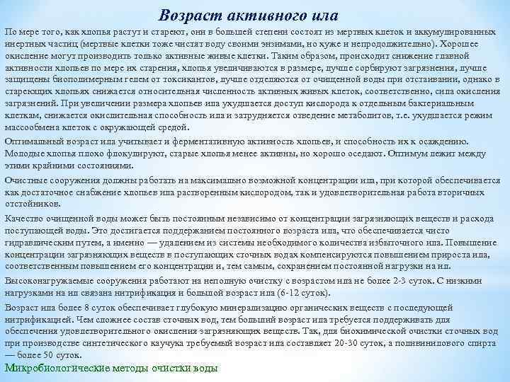 Возраст активного ила По мере того, как хлопья растут и стареют, они в большей степени состоят из мертвых клеток и аккумулированных инертных частиц (мертвые клетки тоже чистят воду своими энзимами, но хуже и непродолжительно). Хорошее окисление могут производить только активные живые клетки. Таким образом, происходит снижение главной активности хлопьев по мере их старения, хлопья увеличиваются в размере, лучше сорбируют загрязнения, лучше защищены биополимерным гелем от токсикантов, лучше отделяются от очищенной воды при отстаивании, однако в стареющих хлопьях снижается относительная численность активных живых клеток, соответственно, сила окисления загрязнений. При увеличении размера хлопьев ила ухудшается доступ кислорода к отдельным бактериальным клеткам, снижается окислительная способность ила и затрудняется отведение метаболитов, т. е. ухудшается режим массообмена клеток с окружающей средой. Оптимальный возраст ила учитывает и ферментативную активность хлопьев, и способность их к осаждению. Молодые хлопья плохо флокулируют, старые хлопья менее активны, но хорошо оседают. Оптимум лежит между этими крайними состояниями. Очистные сооружения должны работать на максимально возможной концентрации ила, при которой обеспечивается как достаточное снабжение хлопьев ила растворенным кислородом, так и удовлетворительная работа вторичных отстойников. Качество очищенной воды может быть постоянным независимо от концентрации загрязняющих веществ и расхода поступающей воды. Это достигается поддержанием постоянного возраста ила, что обеспечивается чисто гидравлическим путем, а именно — удалением из системы необходимого количества избыточного ила. Повышение концентрации загрязняющих веществ в поступающих сточных водах компенсируются повышением прироста ила, соответственным повышением его концентрации и, тем самым, сохранением постоянной нагрузки на ил. Высоконагружаемые сооружения работают на неполную очистку с возрастом ила не более 2 3 суток. С низкими нагрузками на ил связана нитрификация и большой возраст ила (6 12 суток). Возраст ила более 8 суток обеспечивает глубокую минерализацию органических веществ с последующей нитрификацией. Чем сложнее состав сточных вод, тем больший возраст ила требуется поддерживать для обеспечения удовлетворительного окисления загрязняющих веществ. Так, для биохимической очистки сточных вод при производстве синтетического каучука требуемый возраст ила составляет 20 30 суток, а поливинилового спирта — более 50 суток. Микробиологические методы очистки воды
