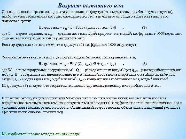 Возраст активного ила Для вычисления возраста ила предложено несколько формул (он выражается в любом случае в сутках), наиболее употребляемая из которых определяет возраст как частное от общего количества ила и его прироста в сутки: Возраст ила = аср · T · 1000 / (прирост ила · 24) , (2) где Т — период аэрации, ч; аср — средняя доза ила, г/дм 3; прирост ила, мг/дм 3; коэффициент 1000 переводит граммы в миллиграммы и имеет размерность мг/г. Если прирост ила дается в г/дм 3, то в формуле (2) коэффициент 1000 отсутствует. Формула расчета возраста ила с учетом расхода избыточного ила принимает вид: Возраст ила = аср · W / (Q qизб) ·B + qизб · аизб) , (3) где W – объем аэрируемых сооружений, м 3; Q — расход сточных вод, м 3/сут; qизб расход избыточного ила, м 3/сут; В содержание взвешенных веществ в очищенной воде после вторичных отстойников, кг/м 3 или мг/дм 3; аср средняя доза ила, г/дм 3 или кг/м 3; аизб концентрация избыточного ила, мг/дм 3 или кг/м 3. Из формулы (3) следует, что возрастом ила можно управлять, изменяя расход избыточного ила. В практике эксплуатации сооружений биологической очистки оптимальный возраст активного ила определяется не только расчетом, но и результатами наблюдений за эффективностью очистки сточных вод в условиях поддержания разного возраста. Оптимальный возраст должен обеспечивать наилучший результат эффективности очистки сточных вод. Микробиологические методы очистки воды