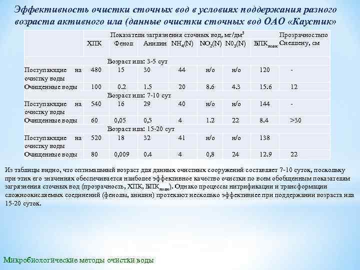 Эффективность очистки сточных вод в условиях поддержания разного возраста активного ила (данные очистки сточных вод ОАО «Каустик» ХПК Поступающие на очистку воды Очищенные воды Показатели загрязнения сточных вод, мг/дм 3 Фенол Анилин NH 4(N) NО 2(N) N 03(N) Прозрачность о п БПКполн Снеллену, см Возраст ила: 3 5 сут 480 15 30 44 н/о 120 100 20 8. 6 4. 3 15. 6 12 40 н/о 144 0, 05 0, 5 4 Возраст ила: 15 20 сут 520 18 32 41 1. 2 22 8. 4 >30 н/о 138 80 0, 8 24 12. 9 0. 2 1. 5 Возраст ила: 7 10 сут 540 16 29 60 0, 009 0. 4 4 22 Из таблицы видно, что оптимальный возраст для данных очистных сооружений составляет 7 10 суток, поскольку при этих его значениях обеспечивается наиболее эффективное качество очистки по всем обобщенным показателям загрязнения сточных вод (прозрачность, ХПК, БПКполн). Однако процессы нитрификации и трансформации сложноокисляемых соединений (фенолы, анилин) протекают несколько эффективнее при поддержании возраста ила 15 20 суток. Микробиологические методы очистки воды