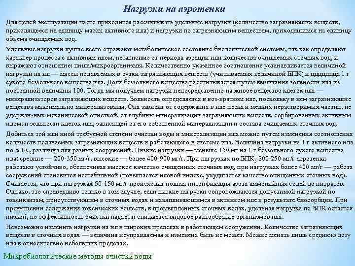 Расчет нагрузок на аэротенки 3. Удельная нагрузка на 1 м 3 аэротенка по органическим загрязняющим веществам (NW г/м 3 в сут): Lосв· Qср NW = , (6) W 4. Удельная нагрузка по органическим загрязняющим веществам на 1 м 3 аэротенка с учетом периода аэрации (NW г/г в сут): Lосв· Qср 24 NWT = · , (7) W T где T — период аэрации, ч. Формула (7) редко используется на практике, однако она хорошо показывает, что нагрузка на единицу объема и период аэрации — взаимосвязанные параметры, зависящие от концентрации загрязняющих веществ в поступающей на очистку воде и от объема аэротенков. Например, если сточные воды с концентрацией по БПК 200 мг/дм 3 поступают в аэротенк с периодом аэрации 24 ч, то получаемая в результате нагрузка на единицу объема составляет 200 г БПК на м 3/сут. Если период аэрации сократится до 8 ч, то нагрузка на единицу объема возрастет в 3 раза и составит 600 г БПК на м 3/сут. Для более точной характеристики удельной нагрузки с учетом беззольного вещества активного ила, концентрации загрязняющих веществ, характеризуемых показателем БПК, объема аэрационных сооружений и периода аэрации используется характеристика удельной нагрузки на 1 г беззольного вещества активного ила по БПК 5 с учетом периода аэрации (NLT, г/г в сут): Lосв· Qср · 100 24 NLT = · , (8) аср · X · W T Микробиологические методы очистки воды