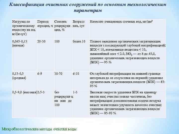 Классификация очистных сооружений по основным технологическим параметрам Нагрузка по Период Степень Возраст органическому аэрации, ч рециркуля ила, сут веществу на ил, ции, % кг/(кгсут) Качество очищенных сточных вод, мг/дм 3 0, 065 0, 15 (низкая) 20 30 100 более 10 Полное окисление органических загрязняющих веществ с последующей глубокой нитрификацией; БПК < 10, взвешенные вещества < 10, аммонийный азот < 2. 0, NO 3 — от 8 до 45, 0, удаление органических загрязняющих веществ (БПК) — 95 % 0, 15 0, 5 (средняя) 6 9 30 70 6 10 От глубокой нитрификации на нижней границе интервала до ее отсутствия на верхней; удаление органических загрязняющих веществ (БПК) — 85 95 % 0, 5 9, 0 (высокая)2. 5 3 без 1 3 рециркуля ц ии или до 100 Микробиологические методы очистки воды Высокая скорость удаления БПК на единицу массы ила; очистка только частичная, без нитрификации: дополнительная подача воздуха может значительно улучшить качество очистки; удаление органических загрязняющих веществ (БПК) — 85 90 %