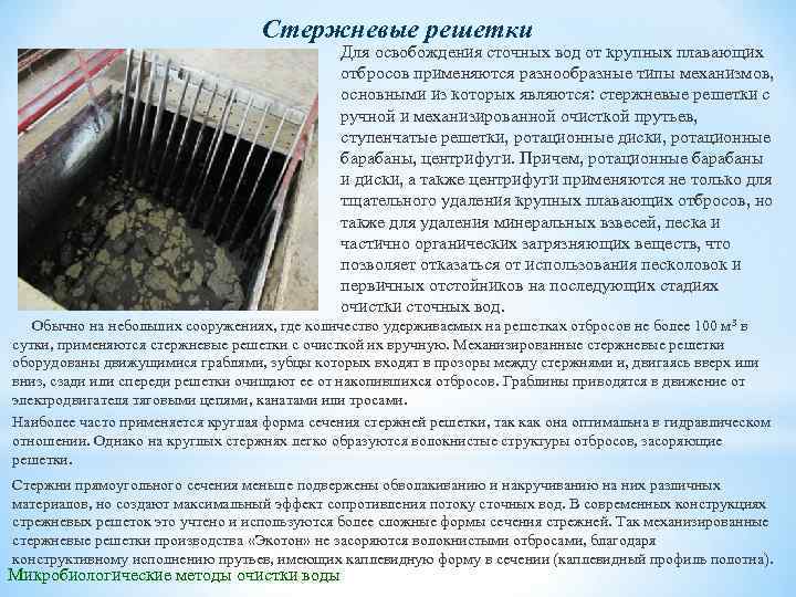 Стержневые решетки Для освобождения сточных вод от крупных плавающих отбросов применяются разнообразные типы механизмов, основными из которых являются: стержневые решетки с ручной и механизированной очисткой прутьев, ступенчатые решетки, ротационные диски, ротационные барабаны, центрифуги. Причем, ротационные барабаны и диски, а также центрифуги применяются не только для тщательного удаления крупных плавающих отбросов, но также для удаления минеральных взвесей, песка и частично органических загрязняющих веществ, что позволяет отказаться от использования песколовок и первичных отстойников на последующих стадиях очистки сточных вод. Обычно на небольших сооружениях, где количество удерживаемых на решетках отбросов не более 100 м 3 в сутки, применяются стержневые решетки с очисткой их вручную. Механизированные стержневые решетки оборудованы движущимися граблями, зубцы которых входят в прозоры между стержнями и, двигаясь вверх или вниз, сзади или спереди решетки очищают ее от накопившихся отбросов. Граблины приводятся в движение от электродвигателя тяговыми цепями, канатами или тросами. Наиболее часто применяется круглая форма сечения стержней решетки, так как она оптимальна в гидравлическом отношении. Однако на круглых стержнях легко образуются волокнистые структуры отбросов, засоряющие решетки. Стержни прямоугольного сечения меньше подвержены обволакиванию и накручиванию на них различных материалов, но создают максимальный эффект сопротивления потоку сточных вод. В современных конструкциях стрежневых решеток это учтено и используются более сложные формы сечения стрежней. Так механизированные стержневые решетки производства «Экотон» не засоряются волокнистыми отбросами, благодаря конструктивному исполнению прутьев, имеющих каплевидную форму в сечении (каплевидный профиль полотна). Микробиологические методы очистки воды