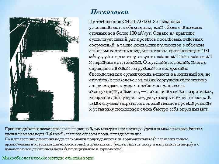 Песколовки По требованию СНи. П 2. 04. 03 85 песколовки устанавливаются обязательно, если объем очищаемых сточных вод более 100 м 3/сут. Однако на практике существует целый ряд проектов поселковых очистных сооружений, а также компактных установок с объемом очищаемых сточных вод значительно превышающим 100 м 3/сут, у которых отсутствуют песколовки или песколовки и первичные отстойники. Отсутствие последних иногда оправдано низкими нагрузками по содержанию биоокисляемых органических веществ на активный ил, но отсутствие песколовок на таких сооружениях постоянно сопровождается рядом проблем в процессе их эксплуатации, а именно, — накопление песка в аэротенках, засорение диффузоров воздуха, быстрый износ насосов. В таких случаях затраты на дополнительное проектирование и установку песколовок очень быстро себя оправдывают. Принцип действия песколовки гравитационный, т. е. минеральные частицы, удельная масса которых больше удельной массы воды (1, 6 г/см 3), главным образом песок, выпадают на дно. По направлению движения воды песколовки подразделяются на горизонтальные (с горизонтальным прямоточным и круговым движением воды), вертикальные (вода подается снизу и направляется вверх) и с водоворотным движением воды (тангенциальные и аэрируемые). Микробиологические методы очистки воды