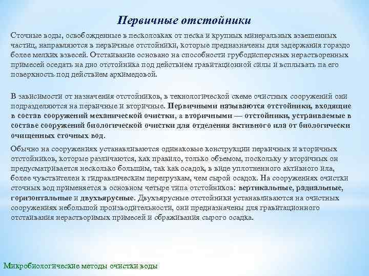 Первичные отстойники Сточные воды, освобожденные в песколовках от песка и крупных минеральных взвешенных частиц, направляются в первичные отстойники, которые предназначены для задержания гораздо более мелких взвесей. Отстаивание основано на способности грубодисперсных нерастворенных примесей оседать на дно отстойника под действием гравитационной силы и всплывать па его поверхность под действием архимедовой. В зависимости от назначения отстойников, в технологической схеме очистных сооружений они подразделяются на первичные и вторичные. Первичными называются отстойники, входящие в состав сооружений механической очистки, а вторичными — отстойники, устраиваемые в составе сооружений биологической очистки для отделения активного ила от биологически очищенных сточных вод. Обычно на сооружениях устанавливаются одинаковые конструкции первичных и вторичных отстойников, которые различаются, как правило, только объемом, поскольку у вторичных он предусматривается несколько большим, так как осадок, в виде уплотненного активного ила, более чувствителен к гидравлическим перегрузкам, чем сырой осадок. На сооружениях очистки сточных вод применяется в основном четыре типа отстойников: вертикальные, радиальные, горизонтальные и двухъярусные. Двухъярусные отстойники устанавливаются на очистных сооружениях небольшой производительности, они предназначены для гравитационного отстаивания нерастворимых примесей и сбраживания сырого осадка. Микробиологические методы очистки воды
