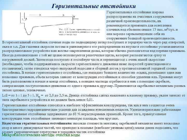 Горизонтальные отстойники широко распространены на очистных сооружениях различной производительности, их рекомендуется применять для осветления сточных вод объемом свыше 15 тыс. м 3/сут. и они хорошо зарекомендовали себя на сооружениях большой производительности. В горизонтальный отстойник сточные воды по подводящему лотку поступают в торцевую часть через ряд отверстий, окна и т. п. Для гашения скорости потока и равномерного его распределения на впуске в отстойнике устанавливается распределительное устройство или жестко закрепленная доска, которая обычно располагается над первым приямком. Иногда дополнительно с той же целью используются решетчатые щиты, которые располагаются сразу за погруженной доской. Затем вода поступает в отстойную часть и перемещается с очень малой скоростью (необходимо, чтобы поддерживались скорости горизонтального движения ниже скоростей гравитационного отстаивания), затем отводится через выпускной водослив в сборный лоток у противоположной торцевой стенки отстойника. В начале горизонтального отстойника, где выпадает большее количество осадка, размещают один или несколько приямков, объем которых зависит от конструкции отстойников и способов удаления ила. Приямки могут быть расположены в начале и конце отстойника, а осевшие частицы сгребаются в них с помощью скребков, совершающих поступательные движения от одного приямка к другому. Применяются скребковые механизмы разных типов: цепные, тележечные. L: S = от 3 : 1 до 5 : 1. Hж = от 2, 0 до 2, 5 м. Днище отстойника слегка наклонено к иловому приямку, уклон зависит от типа скребкового устройства и не должен быть менее 0, 01. Горизонтальные отстойники относятся к наиболее эффективным конструкциям, так как в них создаются очень благоприятные гидродинамические условия для осаждения взвешенных веществ. Удовлетворительно работающие горизонтальные отстойники задерживают до 60 % нерастворимых примесей. Кроме того, прямоугольные конструкции этих отстойников занимают меньшую площадь, чем круглые. Недостатки горизонтальных отстойников: высокая стоимость монтажа; скребковый механизм имеет несколько опор и много движущихся частей, что приводит к поломке (наиболее уязвимы цепи); малая длина водослива, что создает гидравлические перегрузки в торцовых частях отстойника Микробиологические методы очистки воды