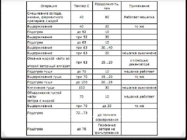 Приготовление сусла Дробленый солод, и при необходимости несоложеные материалы, смешивают с горячей водой в соотношении 1: 4. Полученную смесь медленно перемешивают при подогревании до температуры 50— 52°С в течение 10— 30 мин. 15— 20% растворимых веществ солода при этом переходят непосредственно в раствор без ферментативной обработки. Одновременно происходит ферментативный гидролиз водонерастворимых азотистых веществ и фитина. Затем смесь переводят в заторные чаны, где под действием ферментов солода происходят дальнейший гидролиз и превращение водонерастворимых веществ сырья в водорастворимые, формирующие экстракт будущего сусла. Для обеспечения максимального перехода веществ в раствор затор медленно нагревают при постоянном перемешивании до 70— 72°С (настойный метод).