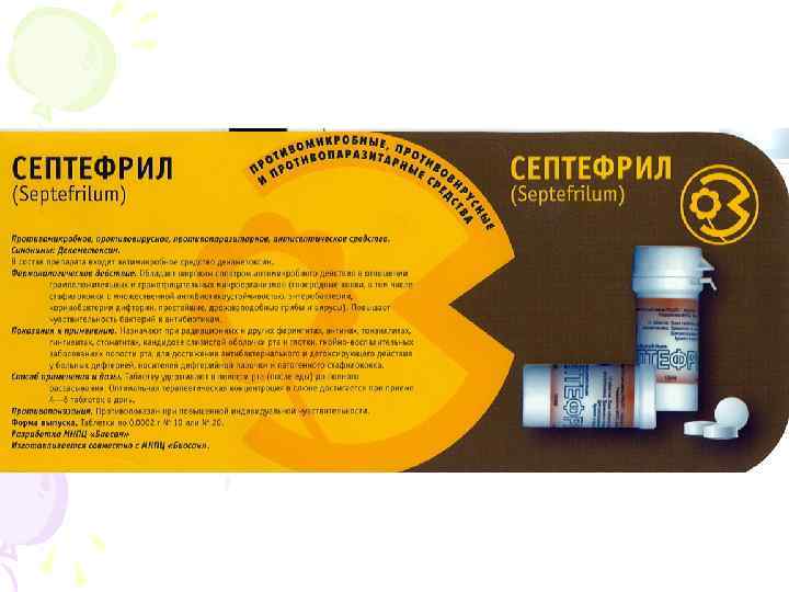 • Офтадек (0, 02%) очні краплі для лікування запальних офтальмологічних захворювань • Септефріл (0, 025%) таблетки для санації ротової порожнини) • Ріносепт (0, 02%) краплі в ніс для лікування гострих і хронічних ринітів • Десептол (0, 125%) супозиторії для лікування запальних гінекологічних захворювань