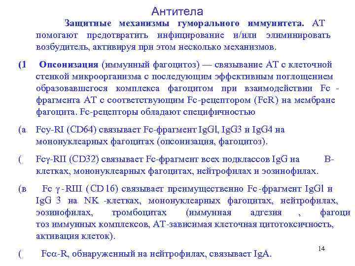 Антитела Защитные механизмы гуморального иммунитета. AT помогают предотвратить инфицирование и/или элиминировать возбудитель, активируя при этом несколько механизмов. (1 Опсонизация (иммунный фагоцитоз) — связывание AT с клеточной стенкой микроорганизма с последующим эффективным поглощением образовавшегося комплекса фагоцитом при взаимодействии Fc фрагмента AT с соответствующим Fc рецептором (Fc. R) на мембране фагоцита. Fc рецепторы обладают специфичностью (а Fcy RI (CD 64) связывает Fc фрагмент Ig. Gl, Ig. G 3 и Ig. G 4 на мононуклеарных фагоцитах (опсонизация, фагоцитоз). ( Fc RII (CD 32) связывает Fc фрагмент всех подклассов Ig. G на В клетках, мононуклеарных фагоцитах, нейтрофилах и эозинофилах. (в Fc RIII ( CD 16) связывает преимущественно Fc фрагмент Ig. Gl и Ig. G 3 на NK клетках, мононуклеарных фагоцитах, нейтрофилах, эозинофилах, тромбоцитах (иммунная адгезия , фагоци тоз иммунных комплексов, АТ зависимая клеточная цитотоксичность, активация клеток). 14 ( Fc R, обнаруженный на нейтрофилах, связывает Ig. A.