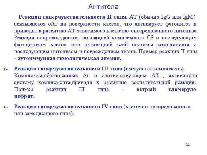 Антитела Реакции гиперчувствительности II типа. AT (обычно Ig. G или Ig. M) связываются с. Аг на поверхности клеток, что активирует фагоцитоз и приводит к развитию АТ зависимого клеточно опосредованного цитолиза. Реакции сопровождаются активацией комплемента СЗ с последующим фагоцитозом клеток или активацией всей системы комплемента с последующим цитолизом и повреждением ткани. Пример реакции II типа аутоиммунная гемолитическая анемия. в. Реакции гиперчувствительности III типа (иммунных комплексов). Комплексы, образованные Аг и соответствующим AT , активируют систему комплемента, приводя к развитию воспалительной реакции. Пример реакции III типа острый гломеруло нефрит. г. Реакции гиперчувствительности IV типа (клеточно опосредованные, или замедленного типа). 24
