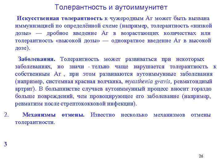 Толерантность и аутоиммунитет Искусственная толерантность к чужеродным Аг может быть вызвана иммунизацией по определённой схеме (например, толерантность «низкой дозы» — дробное введение Аг в возрастающих количествах или толерантность «высокой дозы» — однократное введение Аг в высокой дозе). Заболевания. Толерантность может развиваться при некоторых заболеваниях, но значи тельно чаще нарушается толерантность к собственным Аг , при этом развиваются аутоиммунные заболевания (например, системная красная волчанка, myasthenia gravis, ревматоидный артрит). В большинстве случаев аутоиммунный процесс вносит гораздо больше повреждений, чем провоцирующее его заболевание (например, ревматизм после стрептококковой инфекции). 2. Механизмы отмены. Известно несколько механизмов отмены толерантности. 3 26