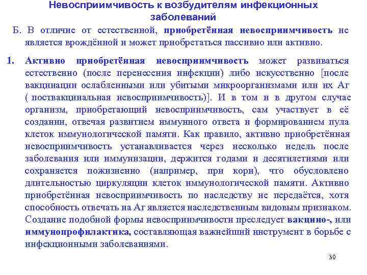 Невосприимчивость к возбудителям инфекционных заболеваний Б. В отличие от естественной, приобретённая невосприимчивость не является врождённой и может приобретаться пассивно или активно. 1. Активно приобретённая невосприимчивость может развиваться естественно (после перенесения инфекции) либо искусственно [после вакцинации ослабленными или убитыми микроорганизмами или их Аг ( поствакцинальная невосприимчивость)]. И в том и в другом случае организм, приобретающий невосприимчивость, сам участвует в её создании, отвечая развитием иммунного ответа и формированием пула клеток иммунологической памяти. Как правило, активно приобретённая невосприимчивость устанавливается через несколько недель после заболевания или иммунизации, держится годами и десятилетиями или сохраняется пожизненно (например, при кори), что обусловлено длительностью циркуляции клеток иммунологической памяти. Активно приобретённая невосприимчивость по наследству не передаётся, хотя способность отвечать на Аг является наследственным видовым признаком. Создание подобной формы невосприимчивости преследует вакцино-, или иммунопрофилактика, составляющая важнейший инструмент в борьбе с инфекционными заболеваниями. 30