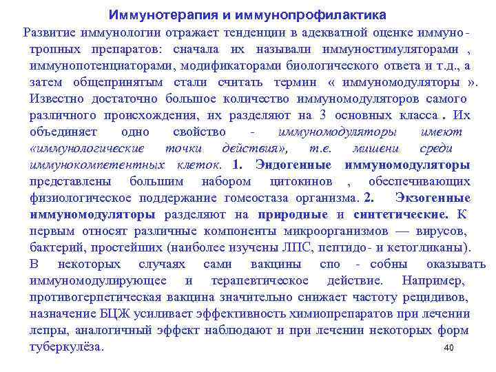 Иммунотерапия и иммунопрофилактика Развитие иммунологии отражает тенденции в адекватной оценке иммуно тропных препаратов: сначала их называли иммуностимуляторами , иммунопотенциаторами, модификаторами биологического ответа и т. д. , а затем общепринятым стали считать термин « иммуномодуляторы » . Известно достаточно большое количество иммуномодуляторов самого различного происхождения, их разделяют на 3 основных класса. Их объединяет одно свойство иммуномодуляторы имеют «иммунологические точки действия» , т. е. мишени среди иммунокомпетентных клеток. 1. Эндогенные иммуномодуляторы представлены большим набором цитокинов , обеспечивающих физиологическое поддержание гомеостаза организма. 2. Экзогенные иммуномодуляторы разделяют на природные и синтетические. К первым относят различные компоненты микроорганизмов — вирусов, бактерий, простейших (наиболее изучены ЛПС, пептидо и кетогликаны). В некоторых случаях сами вакцины спо собны оказывать иммуномодулирующее и терапевтическое действие. Например, противогерпетическая вакцина значительно снижает частоту рецидивов, назначение БЦЖ усиливает эффективность химиопрепаратов при лечении лепры, аналогичный эффект наблюдают и при лечении некоторых форм туберкулёза. 40