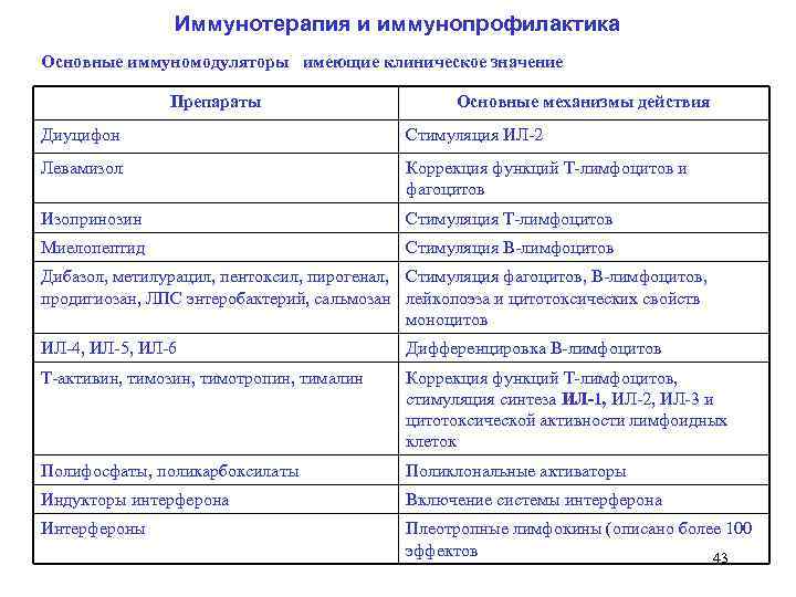 Иммунотерапия и иммунопрофилактика Основные иммуномодуляторы имеющие клиническое значение Препараты Основные механизмы действия Диуцифон Стимуляция ИЛ 2 Левамизол Коррекция функций Т лимфоцитов и фагоцитов Изопринозин Стимуляция Т лимфоцитов Миелопептид Стимуляция В лимфоцитов Дибазол, метилурацил, пентоксил, пирогенал, Стимуляция фагоцитов, В лимфоцитов, продигиозан, ЛПС энтеробактерий, сальмозан лейкопоэза и цитотоксических свойств моноцитов ИЛ 4, ИЛ 5, ИЛ 6 Дифференцировка В лимфоцитов Т активин, тимозин, тимотропин, тималин Коррекция функций Т лимфоцитов, стимуляция синтеза ИЛ-1, ИЛ 2, ИЛ 3 и цитотоксической активности лимфоидных клеток Полифосфаты, поликарбоксилаты Поликлональные активаторы Индукторы интерферона Включение системы интерферона Интерфероны Плеотропные лимфокины (описано более 100 эффектов 43