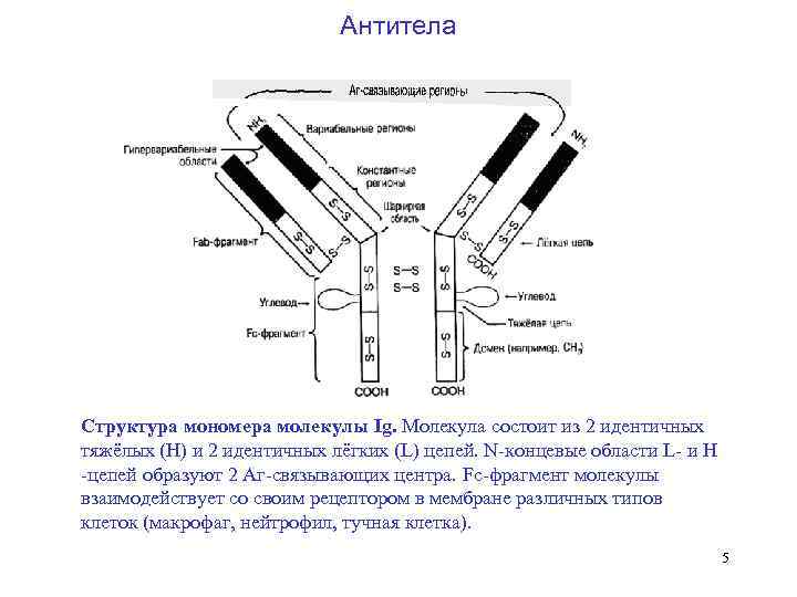 Антитела Структура мономера молекулы Ig. Молекула состоит из 2 идентичных тяжёлых (Н) и 2 идентичных лёгких (L) цепей. N концевые области L и Н цепей образуют 2 Аг связывающих центра. Fc фрагмент молекулы взаимодействует со своим рецептором в мембране различных типов клеток (макрофаг, нейтрофил, тучная клетка). 5