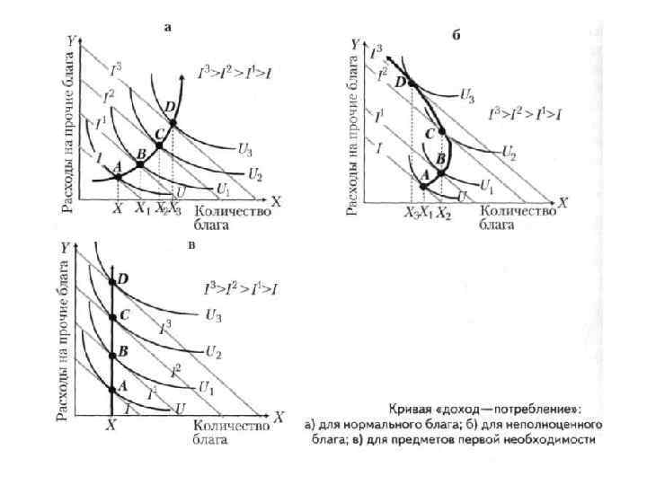 зависимости между уровнем дохода потребителя и спросом не конкретное благо кривая «доход— потребление» кривая, соединяющая равновесные точки при различных уровнях дохода потребителя Каждый новый равновесный набор включает большее количество этого блага (Х 1< Х 2< Х 3< Х 4).