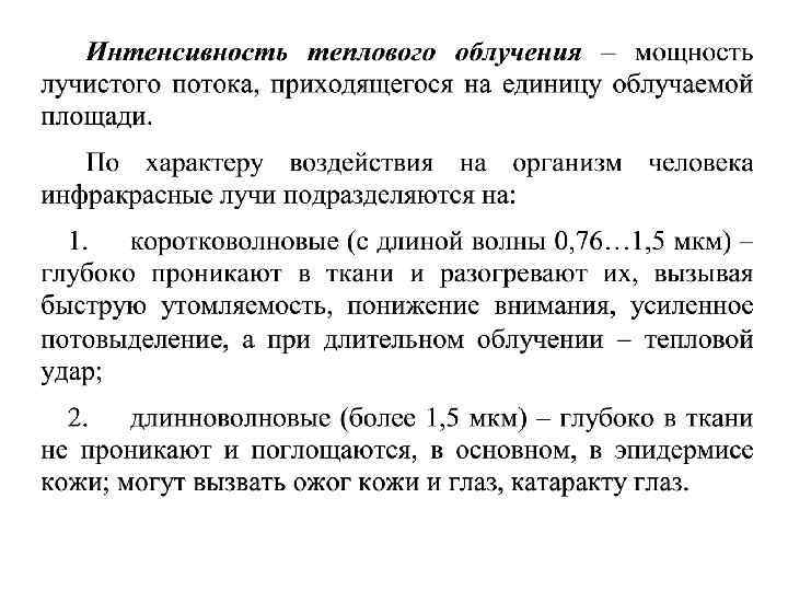 Допустимые величины интенсивности теплового облучения поверхности тела работающих от производственных источников Облучаемая поверхность тела, % 50 и более Интенсивность теплового облучения, Вт/м 2, не более 35 25 -50 70 не более 25 100