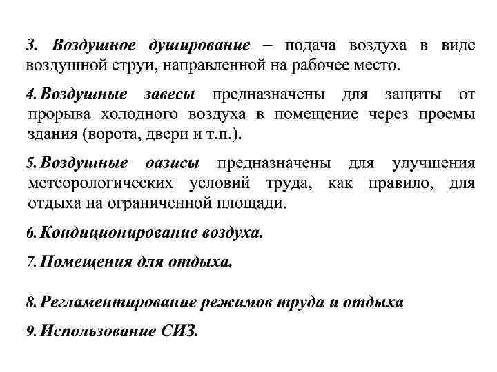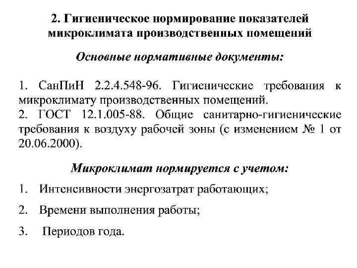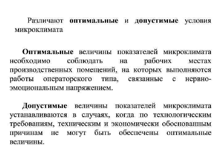 Микроклимат производственных помещений – метеорологические условия внутренней среды этих помещений, которые определяются действующими на организм человека сочетаниями: • температуры; • влажности; • скорости движения воздуха; • теплового облучения. Производственные помещения – замкнутые пространства в специально предназначенных зданиях и сооружениях, в которых постоянно (по сменам) или периодически (в течение рабочего дня) осуществляется трудовая деятельность людей.