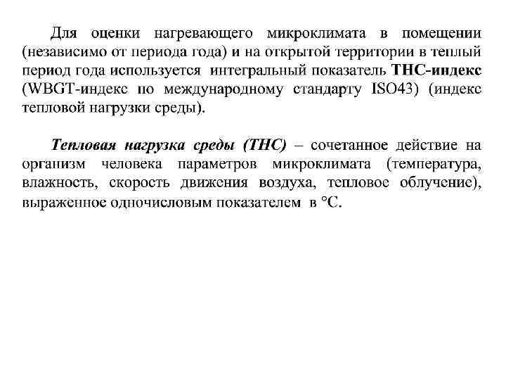 ТНС-индекс рассчитывается по формуле: ТНС-индекс = 0, 7 tвл + 0, 3 tш, где tвл – температура смоченного термометра аспирационного психрометра; tш – температура шарового термометра.