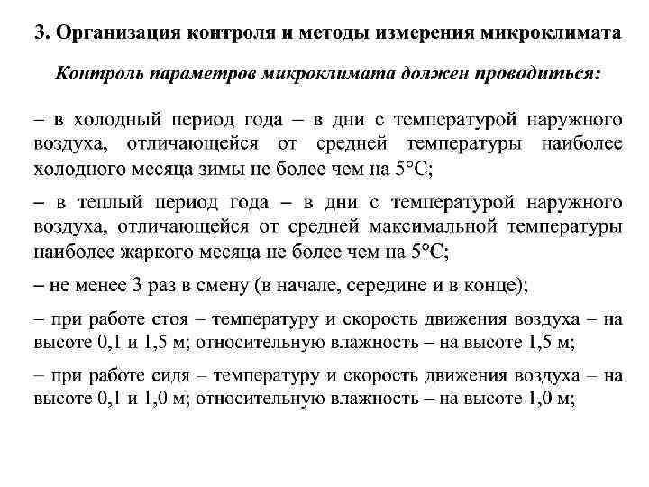 Нормативные значения параметров микроклимата устанавливаются для двух периодов года: • холодный период года – период года, характеризуемый среднесуточной температурой наружного воздуха, равной + 10°С и ниже; • теплый период года – период года, характеризуемый среднесуточной температурой наружного воздуха выше + 10°С. • Среднесуточная температура наружного воздуха – средняя величина температуры наружного воздуха, измеренная в определенные часы суток через одинаковые интервалы времени.