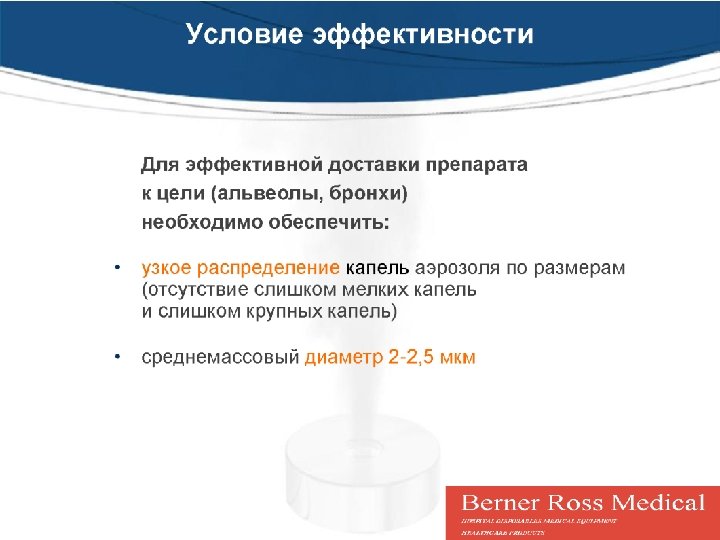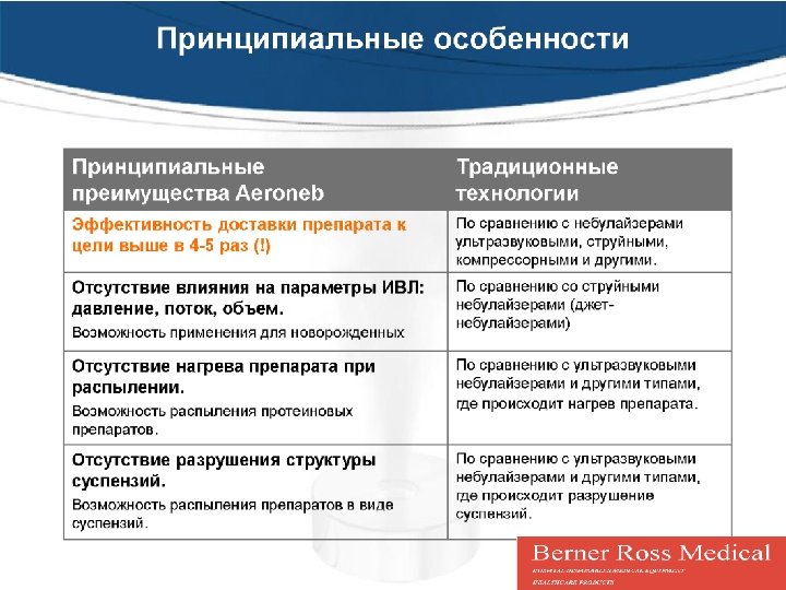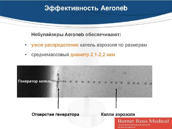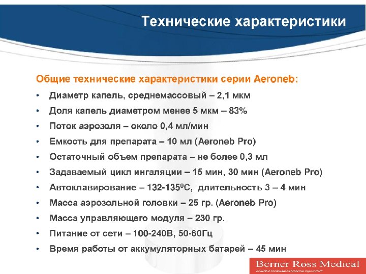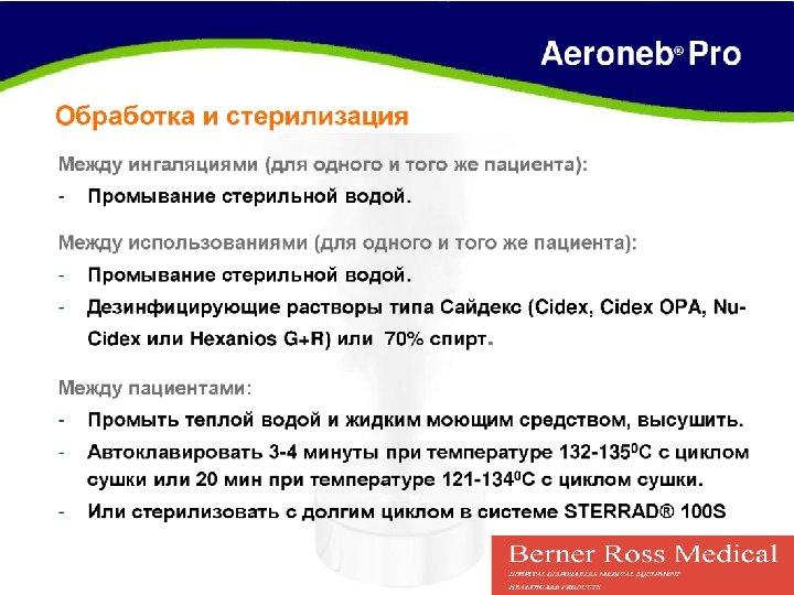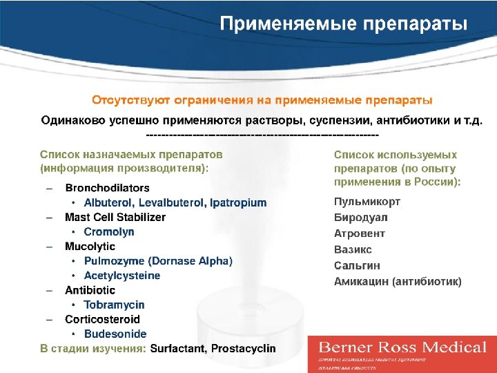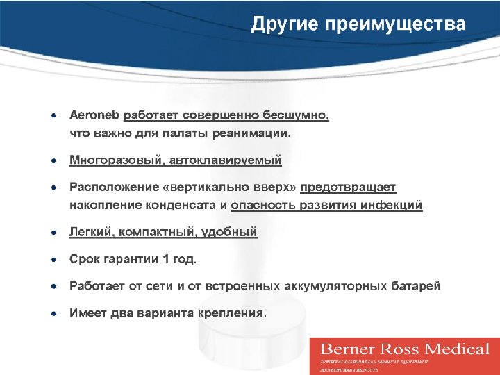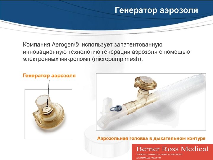 Основные конкуренты небулайзеров Aerogen Небулайзеры отмеренной дозы • Высокая стоимость лекарства • HFA пропеллент • Меньшее количество лекарства приходится на дозу Copyright © 2012 Aerogen. All rights reserved. Небулайзеры малого объема (джетнебулайзеры) • Меняет поток в контуре • Доставляет в 4 раза меньше лекарства, чем Aerogen • Большой остаточный объем -потеря лекарства Небулайзеры, приводимые в действие дыханием • Доступен только вне реанимации • У младенцев и пожилых людей могут быть проблемы с использованием