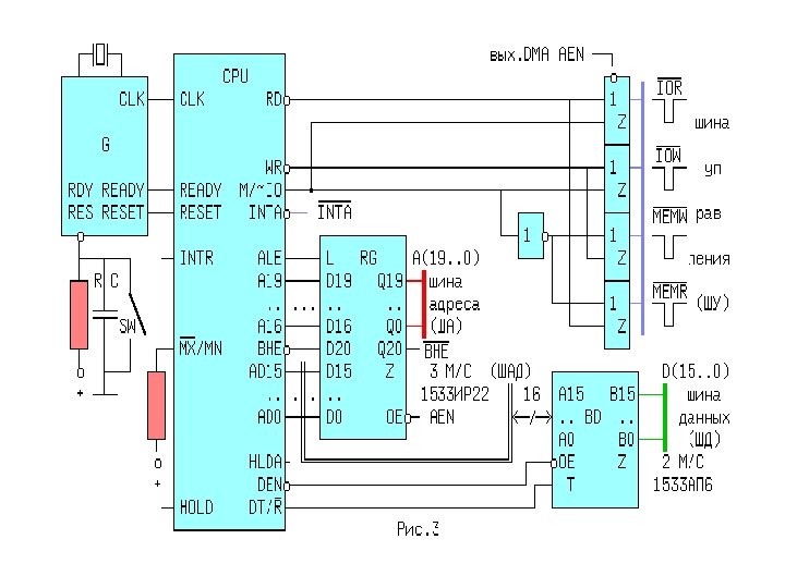 В такте T 1 микропроцессор передает по совмещенной шине адрес/данные адрес ячейки памяти или внешнего устройства (ВУ), подключенного к шинам ШУ, ША и ШД. В такте T 2 производится выбор направления обмена данными с памятью или ВУ, а в тактах T 3, T 4 - передача данных. Если ЗУ (запоминающее устройство) или ВУ медленные, то на вход готовности RDY посылается сигнал RDY = 0, по которому МП вставляет циклы ожидания TW, до тех пор, пока не будет установлена готовность ВУ или ЗУ (RDY = 1). Если в цикле нет обращения к шине, то МП формирует холостые циклы TI. Для разделения сигналов совмещенной шины адрес/данные ШАД(AD 15. . 0) их необходимо "демультиплексировать" с помощью регистра защелки адреса RG и двунаправленного буфера BD. При обращении к памяти (в том числе при выборке команды) микропроцессор передает по ШАД адрес ячейки памяти. Этот адрес записывается в D-триггеры регистра RG сигналом ALE генерируемым микрпроцессором в этот момент и поступающим на синхровходы D-триггеров. Адрес в регистре сохраняется на время последующей передачи данных. Следом по ШАД передаются, либо данные от микропроцессора к ВУ или ЗУ, либо в обратном направлении. МП должен, вопервых, обеспечить правильное направление передачи буфера BD и , вовторых, открыть (разрешить) тристабильные элементы буфера для передачи данных. Первую задачу решает сигнал МП ~DT/R (~DT/R=0 передача данных от МП - Transmit, ~DT/R=1 прием данных МП - Receive). Вторая задача решается генерацией МП сигнала ~DEN (Data Enable). Чтение или ввод данных в один из регистров МП осуществляется с помощью инверсных сигналов шины управления (ШУ): ~MEMR (чтение из памяти), ~IOR (ввод из ВУ), называемыми еще стробами чтения. Запись или вывод данных из МП по шине данных сопровождается стробами записи ~MEMW (запись в память (ЗУ)), или ~IOW (вывод во внешнее устройство (ВУ)).