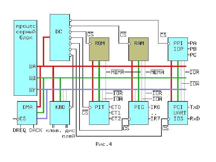 Если в системе используется режим прерывания выполнения основной программы внешними устройствами, требующими безотлагательного вмешательства микропроцессора, то может применяться программируемый контроллер прерываний ПКП - PIC (устройство собирающее заявки на обслуживание от ВУ с входов IRi). Подробно прерывания будут рассмотрены ниже. Обмен данными между МП и ЗУ или одним из ВУ возможен только при появлении на выходе дешифратора DC единственного сигнала ~CS = 0, поступающего на то устройство с которым будет производиться запись или чтение байта данных. Остальные (невыбранные) устройства будут в пассивном состоянии, т. к. их сигналы ~CS = 1. Байт информации на ШД считывается ВУ, ЗУ или МП в строго ограниченном интервале времени во время действия одного из управляющих сигналов чтения/записи (~MEMR, ~MEMW) из памяти или в память, или во время действия одного из сигналов управления вводом/выводом (~IOR, ~IOW) в/из ВУ. Быстрый обмен данными может производиться с помощью устройства прямого доступа к памяти ПДП (DMA).