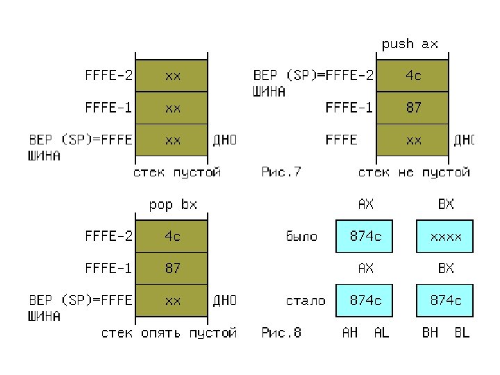 Пусть начальное значение аккумулятора AX равно 874 c. Команда PUSH выполняется в четыре этапа: • Адрес в SP уменьшается на 1: (SP) <-- (SP) - 1. • По этому адресу помещается старший байт 87: ((SP)) <-- (AH). • Содержимое SP снова уменьшается на 1: (SP) <-- (SP) - 1. • По полученному адресу загружается младший байт 4 c: ((SP)) <-- (AL). Действие команды POP аналогично описанному процессу, но в происходит в обратном порядке: • • (BL) <- ((SP)), (SP) <- (SP) + 1, (BH) <- ((SP)), (SP) <- (SP) + 1. Байты в стек помещаются по правилу "старший байт по старшему адресу“. На рис. 7 показан пустой стек до выполнения команды PUSH AX и после ее выполнения, а на рис. 8 после выполнения команды POP BX.