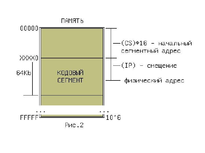 ОРГАНИЗАЦИЯ ПАМЯТИ И ВЫЧИСЛЕНИЕ АДРЕСА 16 -ти битовая шина данных ШД может пересылть информацию байтами или словами. Память обычно организована в виде линейного одномерного массива байтов, причем два соседних байта могут рассматриваться как слово. Все мегабайтное пространство памяти условно делится на 16 сегментов объемом по 64 Kb. Микропроцессору доступны в каждый момент четыре кодовый сегмент, где хранится программа, стековый сегмент, сегмент данных программы и дополнительный сегмент данных. Начальные адреса этих сегментов хранятся в регистрах CS, SS, DS и ES. Так как эти регистры 16 -ти битовые, а все адресное пространство 20 -ти битовое, то МП начальный сегментный адрес в 20 -ти битовом сумматоре сдвигает на четыре бита влево (эквивалентно умножению на 16) и складывает с содержимым одного из регистров (IP, SP, DI, SI). Полученное число называется физическим адресом. Например, извлекая из памяти очередной байт кода программы МП формирует физический адрес по формуле: Физический адрес = (IP) + (CS) * 16, где (IP) - смещение, эффективный или исполнительный адрес, (CS) - сегментный адрес, а (CS) * 16 называется начальным сегментным адресом. Организация памяти приведена на рис. 2.