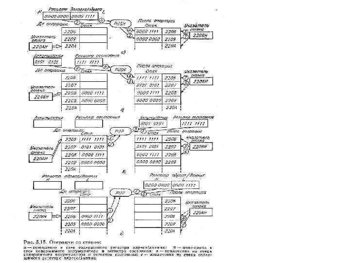 Загрузка стека • На рис. 5. 15, б показано выполнение другой операции загрузки. На этот раз в стек загружается содержимое аккумулятора и регистра состояния. Проследим снова за событиями, отмеченными цифрами в кружках. 5. До операции указатель стека указывает на последнюю ячейку стека. Ее называют вершиной стека. Затем указатель стека декрементируется до 2207 Н. 6. Указатель стека указывает на ячейку памяти 2207 Н, и содержимое аккумулятора (01012) загружается в стек по этому адресу.
